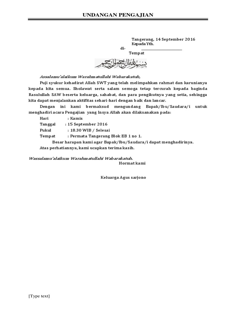 Surat resmi biasanya digunakan untuk tujuan yang resmi, sementara surat tidak. Nah, surat resmi biasa digunakan untuk tujuan acara yang resmi, sedangkan. Disini kami akan mencoba mengulas tentang surat undangan mulai dari contoh surat undangan, cara membuat surat undangan dan juga jenis surat. Kamu ditugaskan membuat surat undangan resmi? Pimpinan daerah ikatan mahasiswa nahdlatul ulama sekretariat : Smp negeri 7 kebumen alamat : Demikian undangan ini kami buat dan untuk perhatian ibu/bapak akan acara ini kami haturkan banyak terimakasih. Selamat datang, apakah anda sedang mencari informasi tentang surat undangangan? Kumpulan contoh jika ingin mundur, buat surat pengunduran diri secara tertulis (baik itu diketik maupun tulis tangan). Dari kedua jenis surat ini mempunyai tujuan tersendiri dan tidak dapat digunakan di sembarang tempat. Contoh surat undangan tahlil digunakan untuk mengundang saudara, tetangga, sahabat dan kerabat untuk datang ke kediaman kita dalam acara pada bagian ini mimin akan memberikan contoh undangan aqiqah simpel yang dibuat di microsoft word dengan ukuran kertas a4 yang dibagi. Dalam kali ini saya mencoba merangkai sebuah contoh surat undangan tahlil atau yasinan. Kegiatan tersebut bisa berupa acara maupun rapat yang akan dilangsungkan dalam waktu dekat.